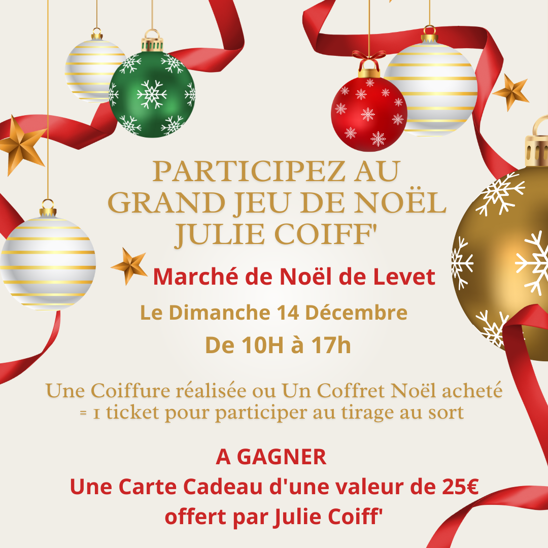 Vous pouvez participer à ce Grand Jeu de Noël lors d'une prestation Coiffure sur le Marché de Noël de Levet ou bien un Achat d'un Coffret Noël.